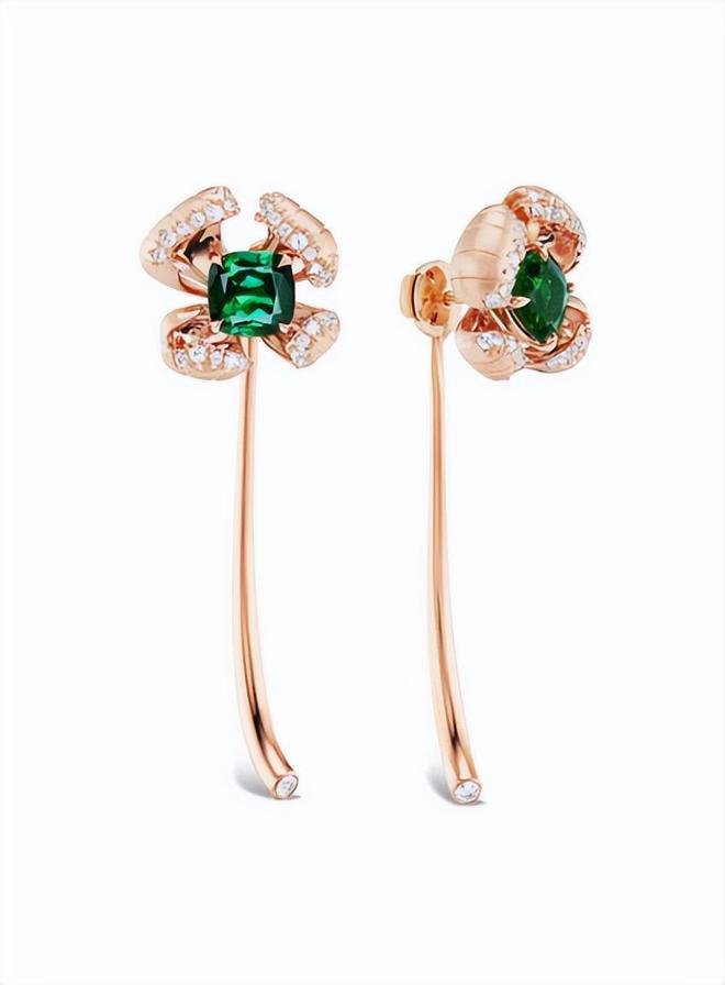 每只耳环上各点缀一朵精致的小花,绿色托帕石点缀的花蕊,颜色浓郁、明亮,充满生机,玫瑰金材质的花瓣,纹理刻画细腻入微,边缘点缀的钻石,增添精致感,造型栩栩如生。