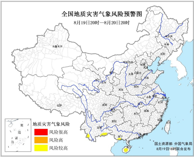 预计,8月19日20时至8月20日20时,云南南部、广西南部、海南岛中部等地的部分地区发生地质灾害的气象风险较高。请当地居民注意防范强降水引发的地质灾害,尤其是地质灾害隐患点附近区域。
