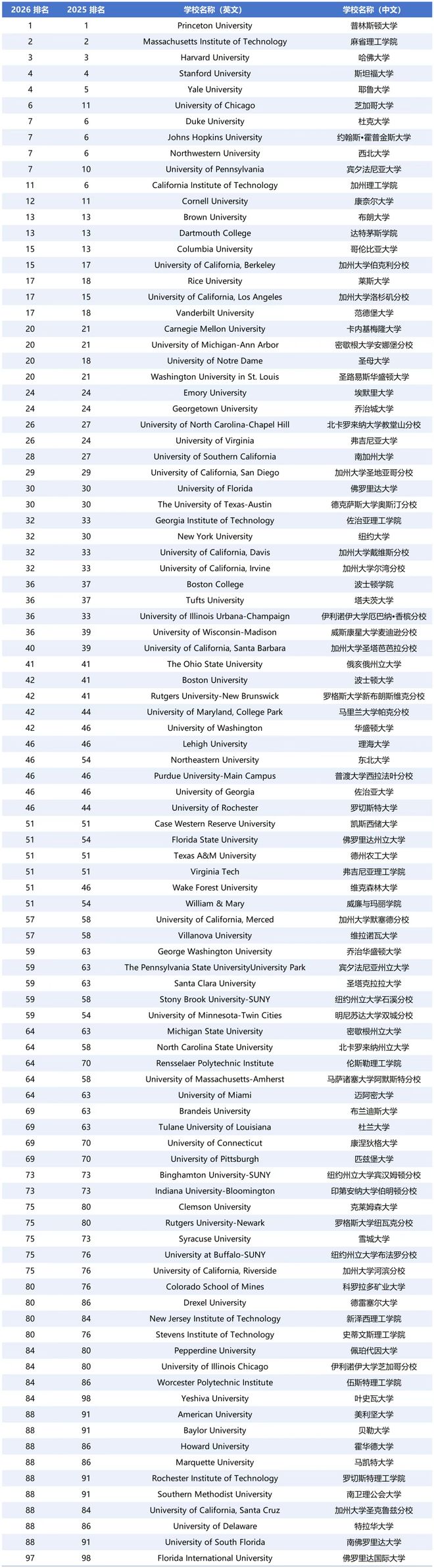 - 最新2026 USNews美国大学发布!普林保持第一CMU首进前20!2025-10-01