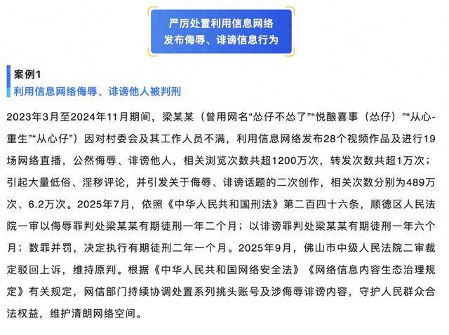 该消息显示,2023年3月至2024年11月期间,梁某某(曾用网名“怂仔不怂了”“悦酿喜事(怂仔)”“从心-重生”“从心仔”)因对村委会及其工作人员不满,利用信息网络发布28个视频作品及进行19场网络直播,公然侮辱、诽谤他人,相关浏览次数共超1200万次,转发次数共超1万次;引起大量低俗、淫秽评论,并引发关于侮辱、诽谤话题的二次创作,相关次数分别为489万次、6.2万次。2025年7月,依照《中华人民共和国刑法》第二百四十六条,顺德区人民法院一审以侮辱罪判处梁某某有期徒刑一年二个月;以诽谤罪判处梁某某有期徒刑一年六个月;数罪并罚,决定执行有期徒刑二年一个月。2025年9月,佛山市中级人民法院二审裁定驳回上诉,维持原判。根据《中华人民共和国网络安全法》《网络信息内容生态治理规定》有关规定,网信部门持续协调处置系列挑头账号及涉侮辱诽谤内容,守护人民群众合法权益,维护清朗网络空间。