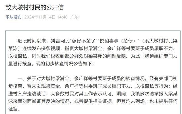 2024年12月5日,广东佛山市顺德区乐从镇专项调查组发布《关于近期网民关注大墩村相关问题调查情况的通报》,通报村民梁某泳指责大墩村村委会主任梁满全、副主任余广祥等村“两委”班子成员履职不力、以权谋私一事的调查取证情况。